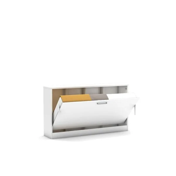 The Diva Life bed is a horizontally opening single wall bed within a modern and robust cabinet with additional shelving provided.